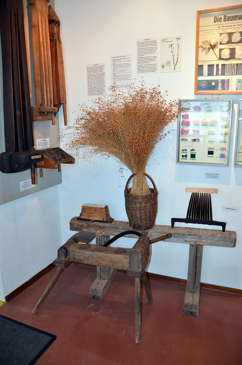 Schauen wir uns um, sieht man alle Geräte, um Leinen herzustellen - von der Ernte über das Spinnen bis zum Weben ist alles vorhanden.