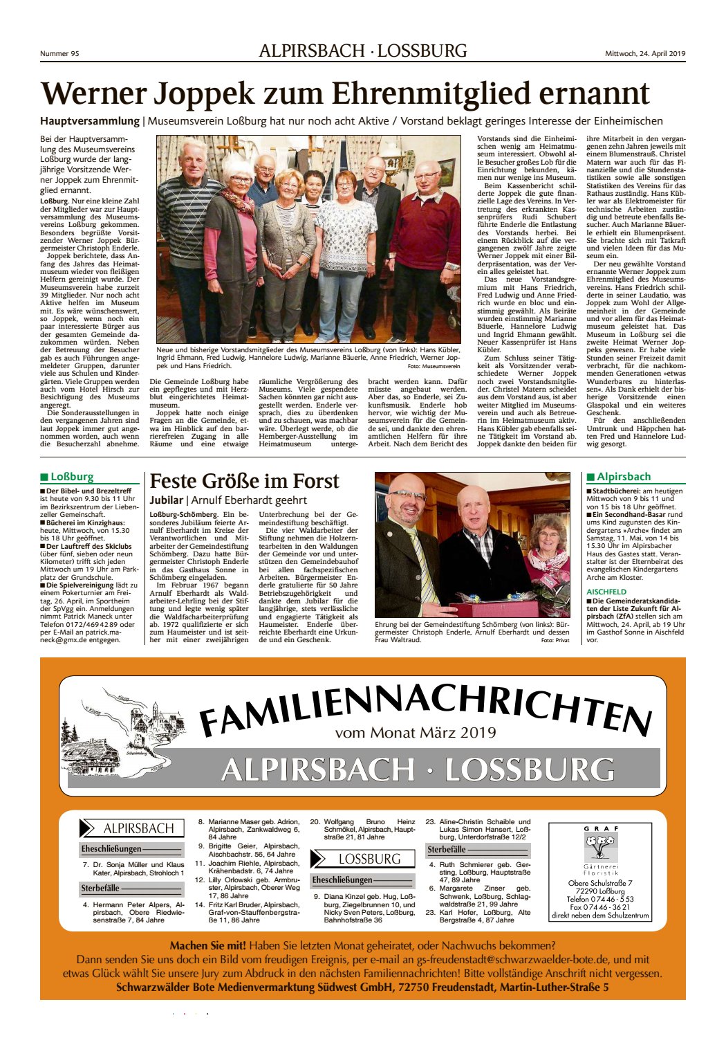 Der neu gewählte Vorstand ernannte Werner Joppek zum Ehrenmitglied des Museumsvereins. Hans Friedrich schilderte in seiner Laudatio, was Joppek zum Wohl der Allgemeinheit in der Gemeinde und vor allem für das Heimatmuseum geleistet hat. Das Museum in Loßburg sei die zweite Heimat Werner Joppeks gewesen. Er habe viele Stunden seiner Freizeit damit verbracht, für die nachkommenden Generationen »etwas Wunderbares zu hinterlassen«. Als Dank erhielt der bisherige Vorsitzende einen Glaspokal und ein weiteres Geschenk. Für den anschließenden Umtrunk und Häppchen hatten Fred und Hannelore Ludwig gesorgt.